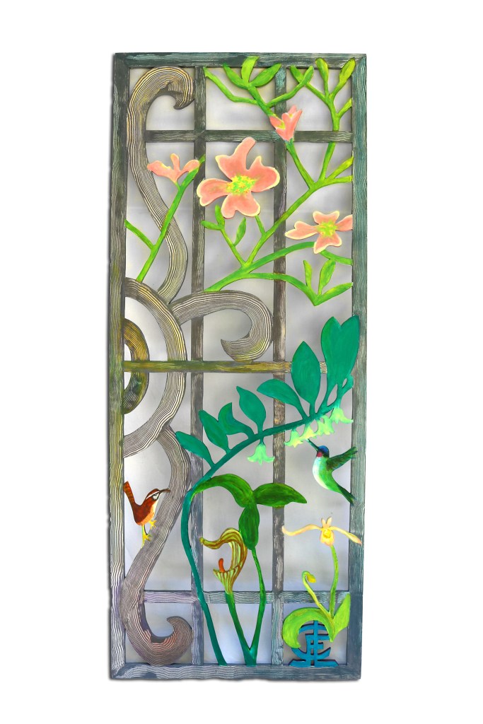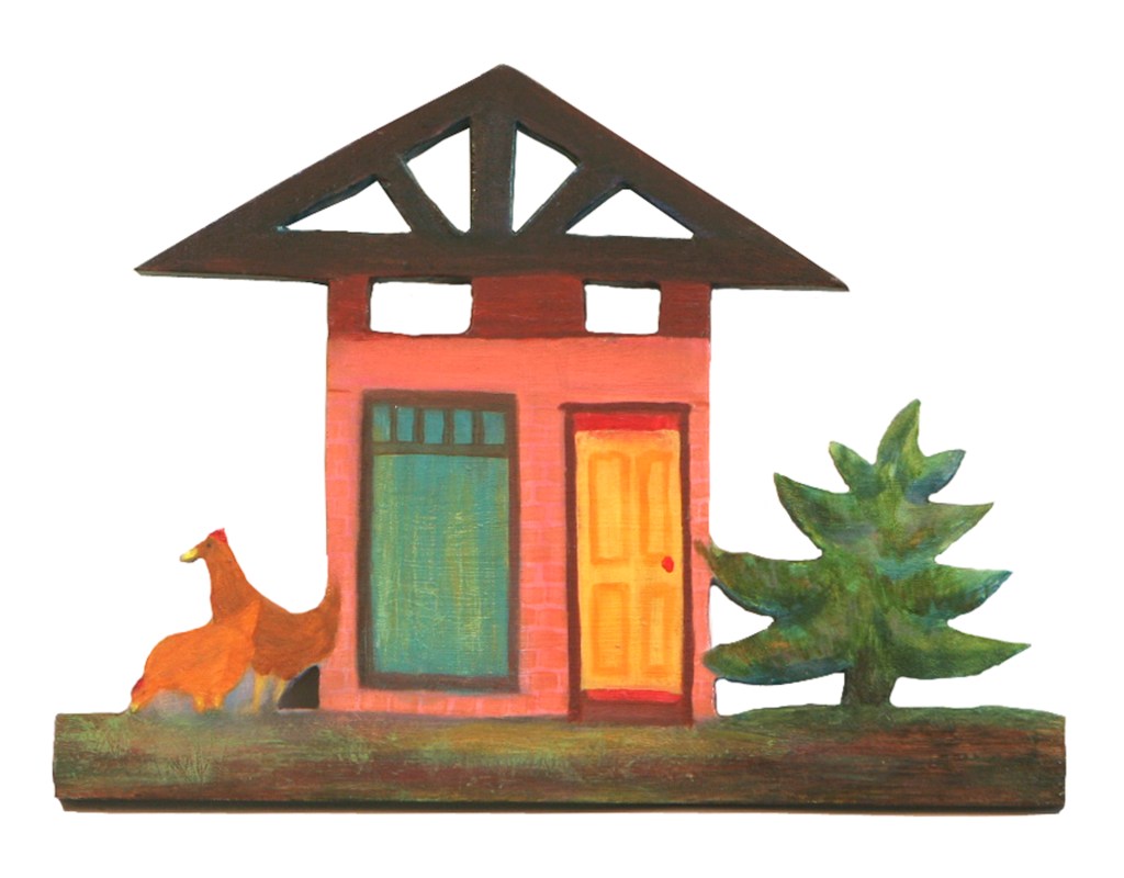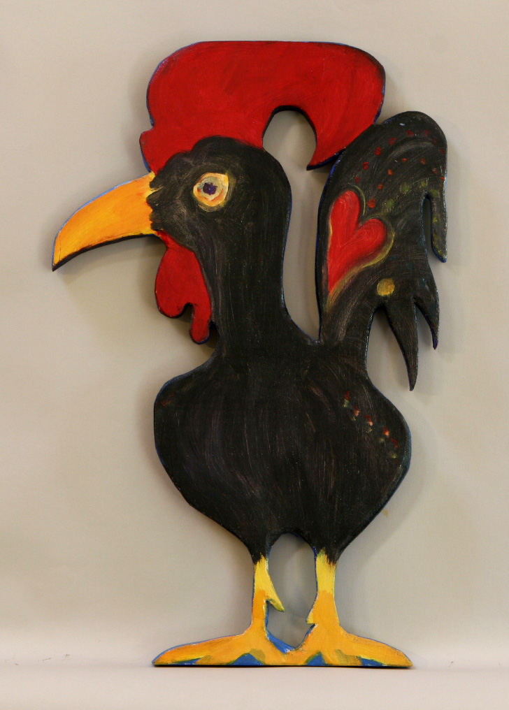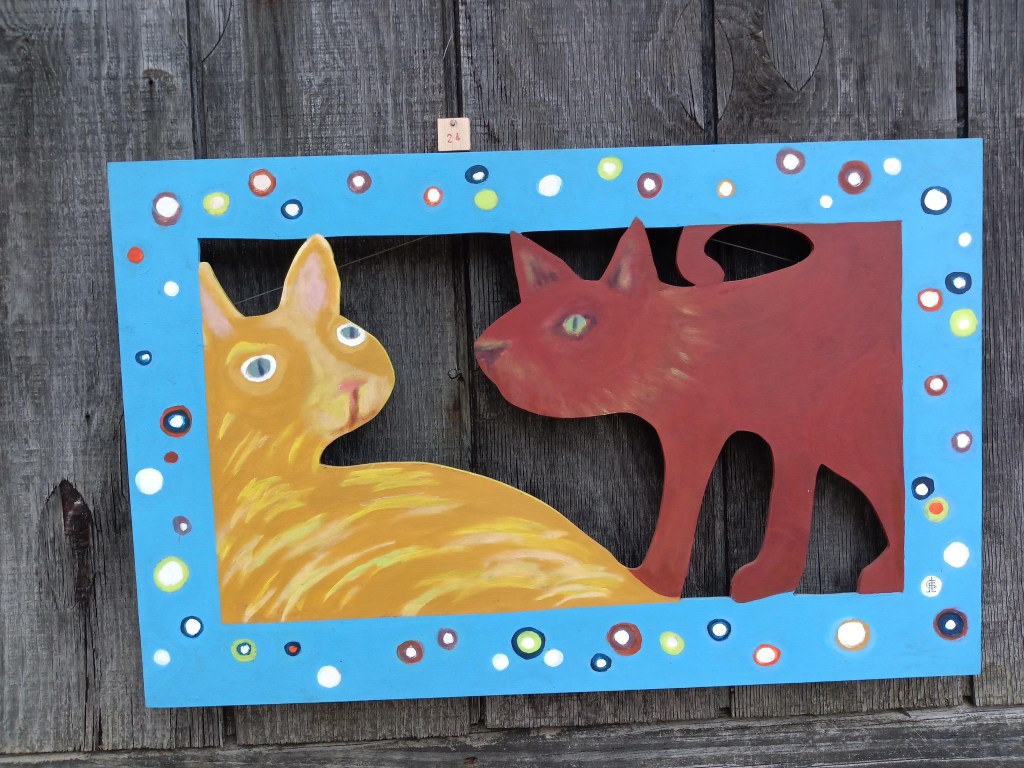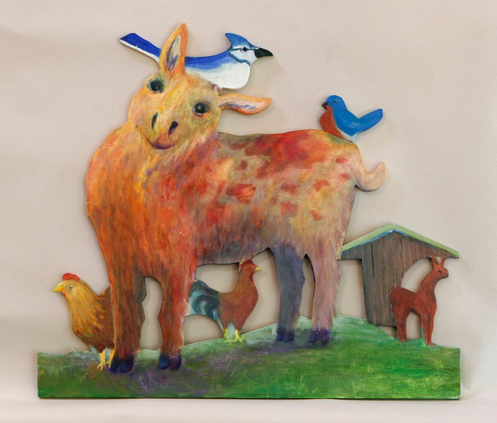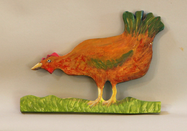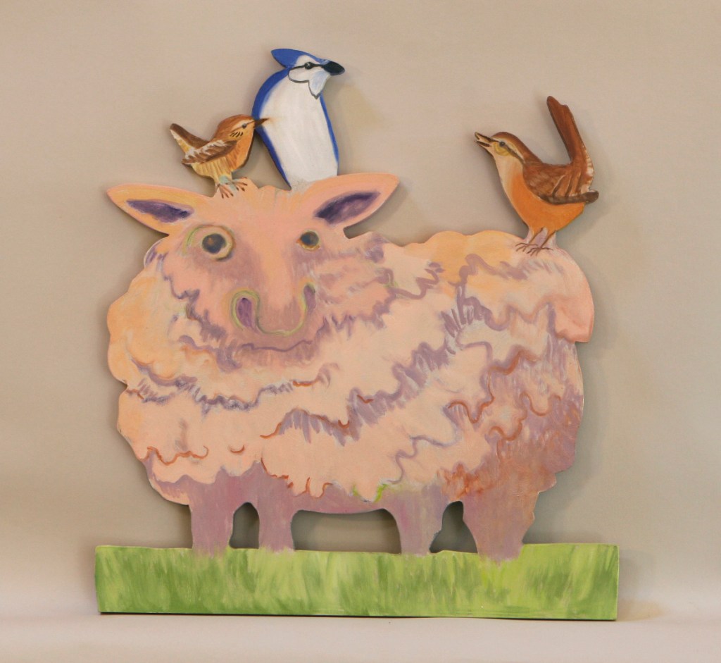 My work is first cut from a wood panel, then sanded and painted. The paintings have cut-out areas to add a sculptural quality and folk art tone. Each piece is clear coated to protect it for outdoor exposure. To keep the colors bright an additional clear coat is desired once a year.