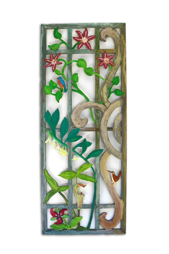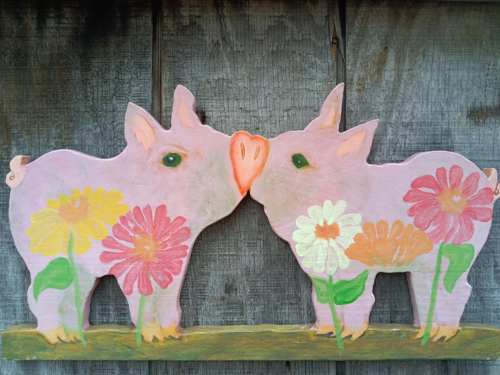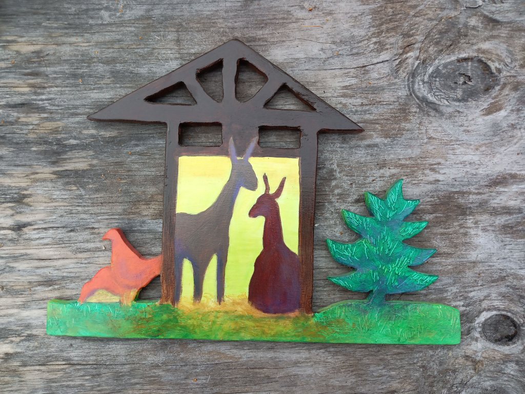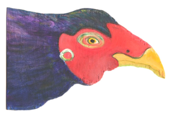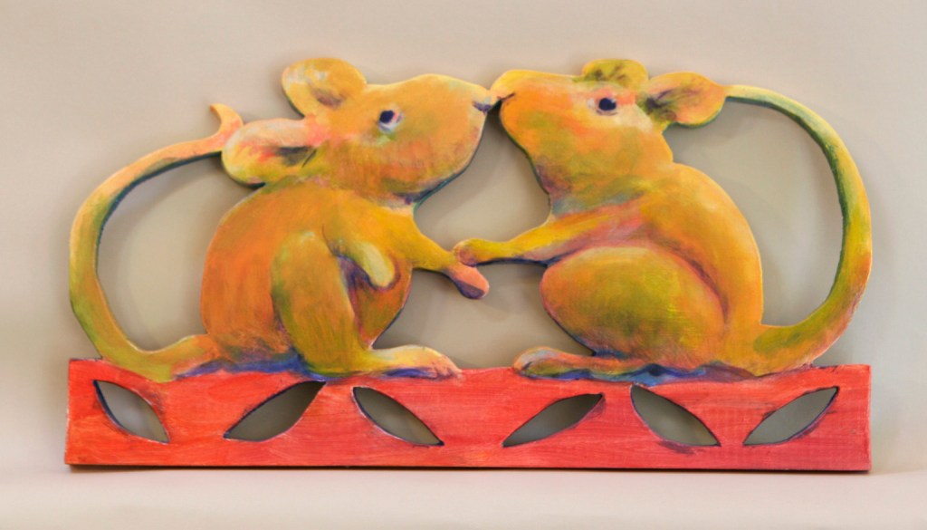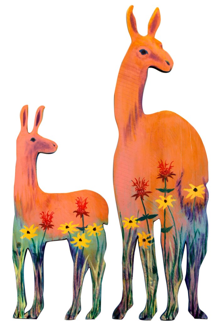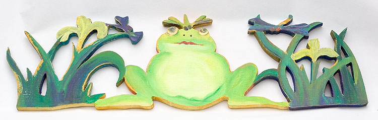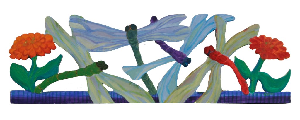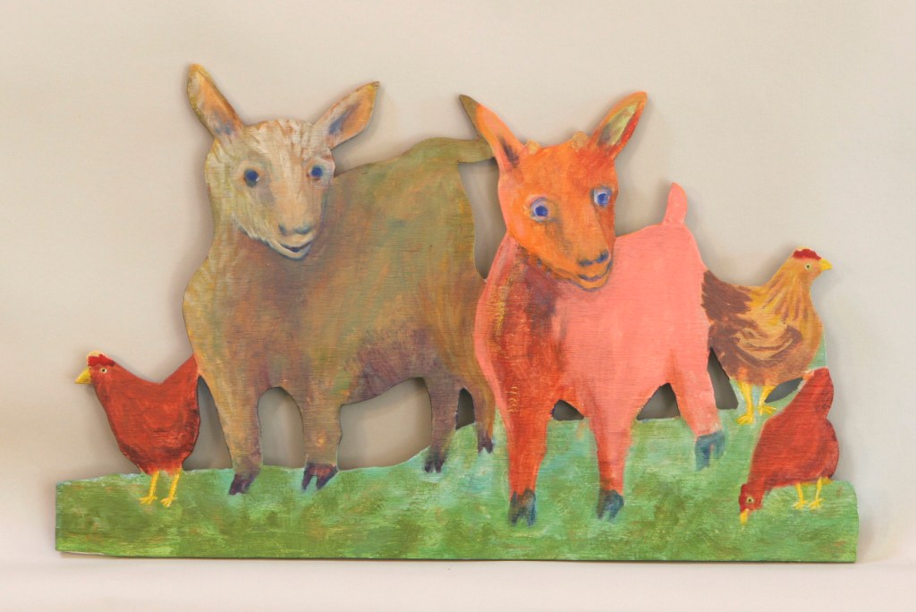 My work is first cut from a wood panel, then sanded and painted. The paintings have cut-out areas to add a sculptural quality and folk art tone. Each piece is clear coated to protect it for outdoor exposure. To keep the colors bright an additional clear coat is desired once a year.