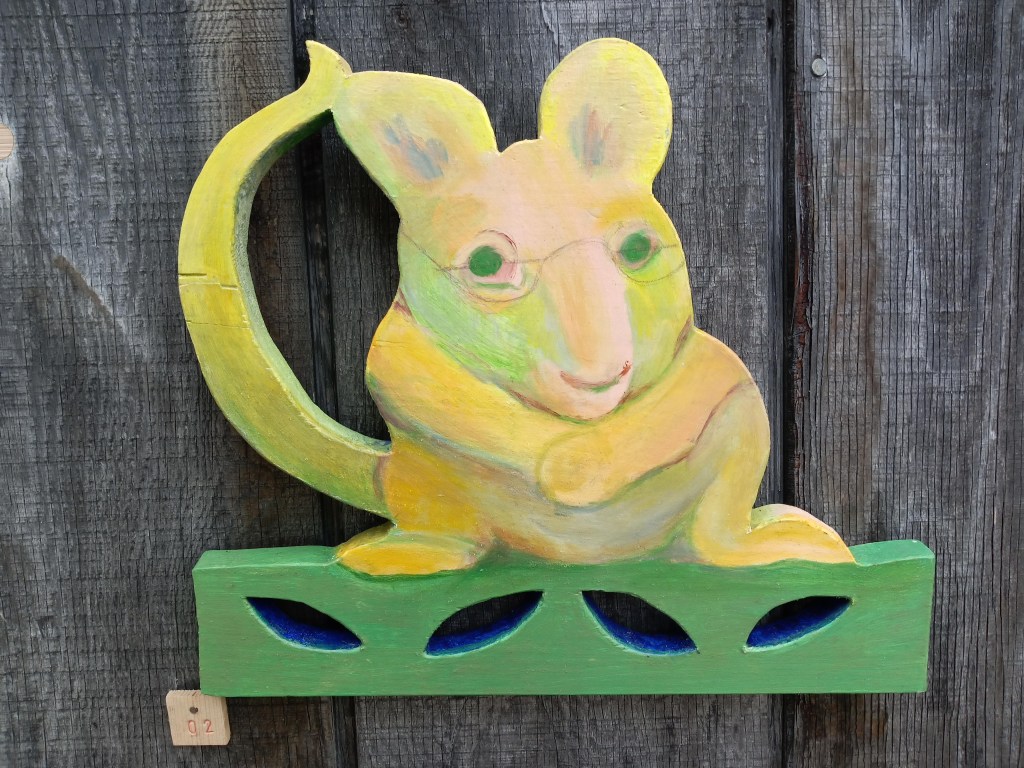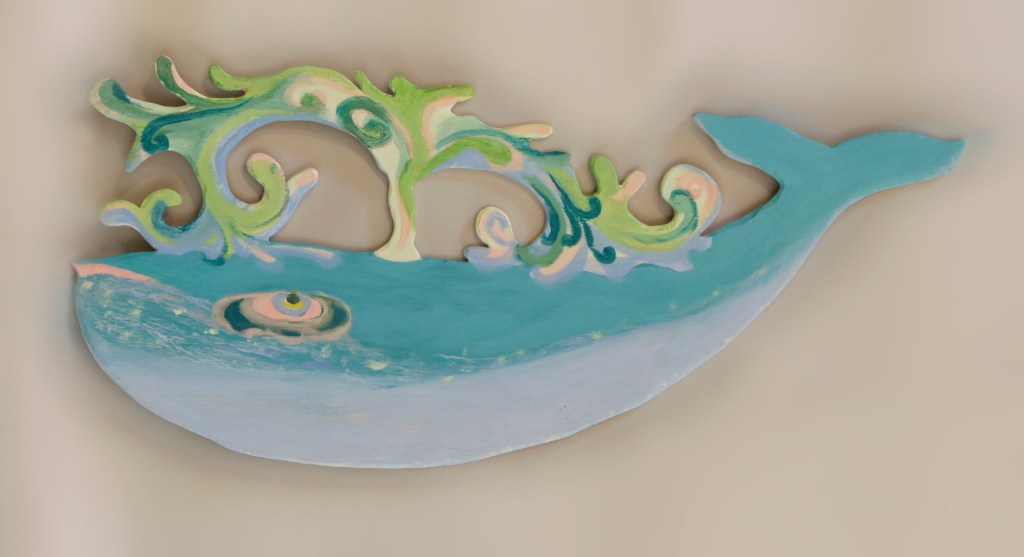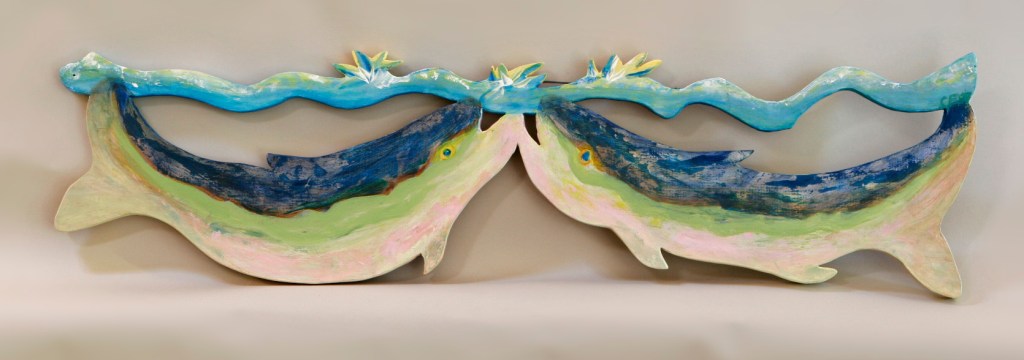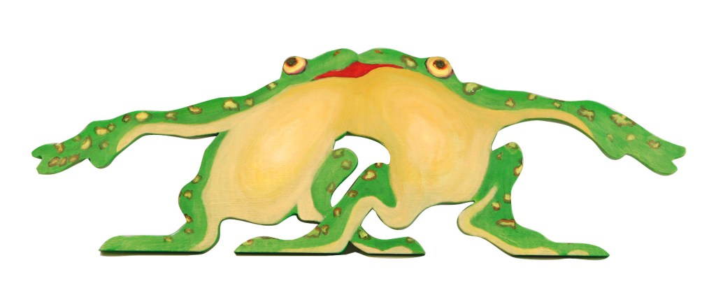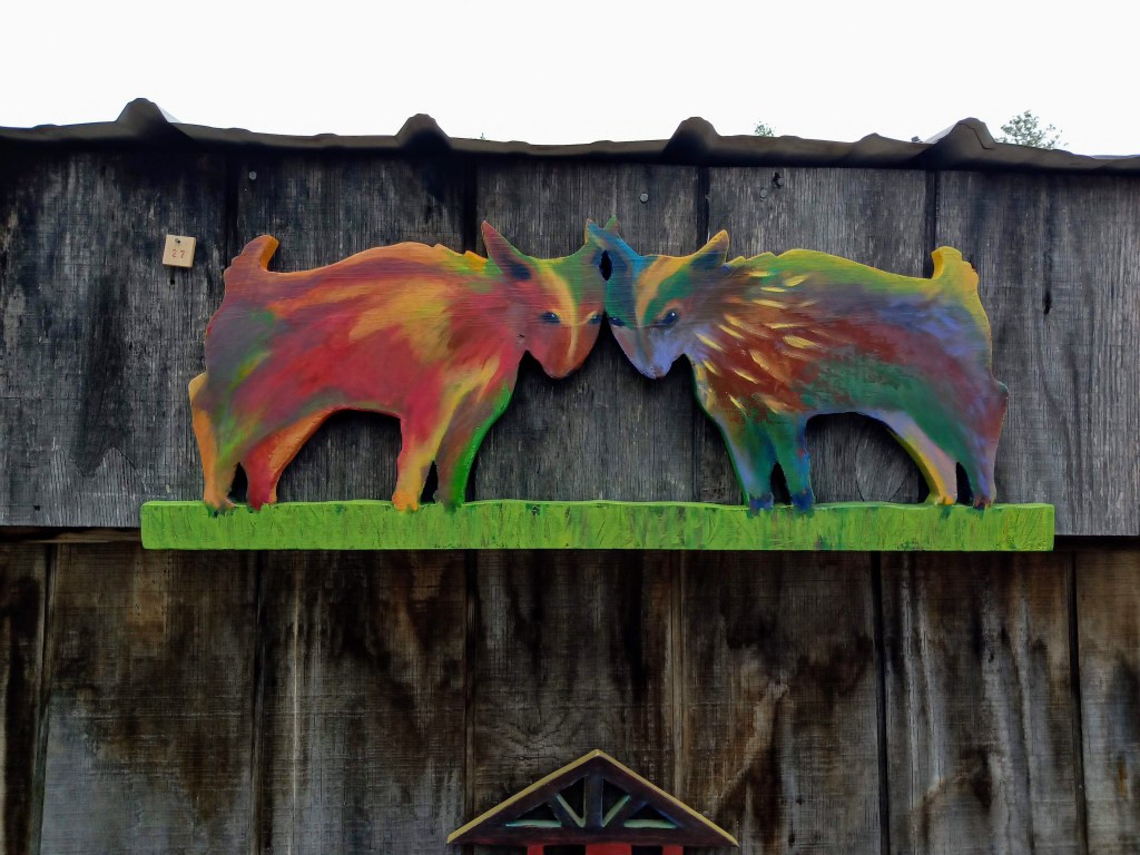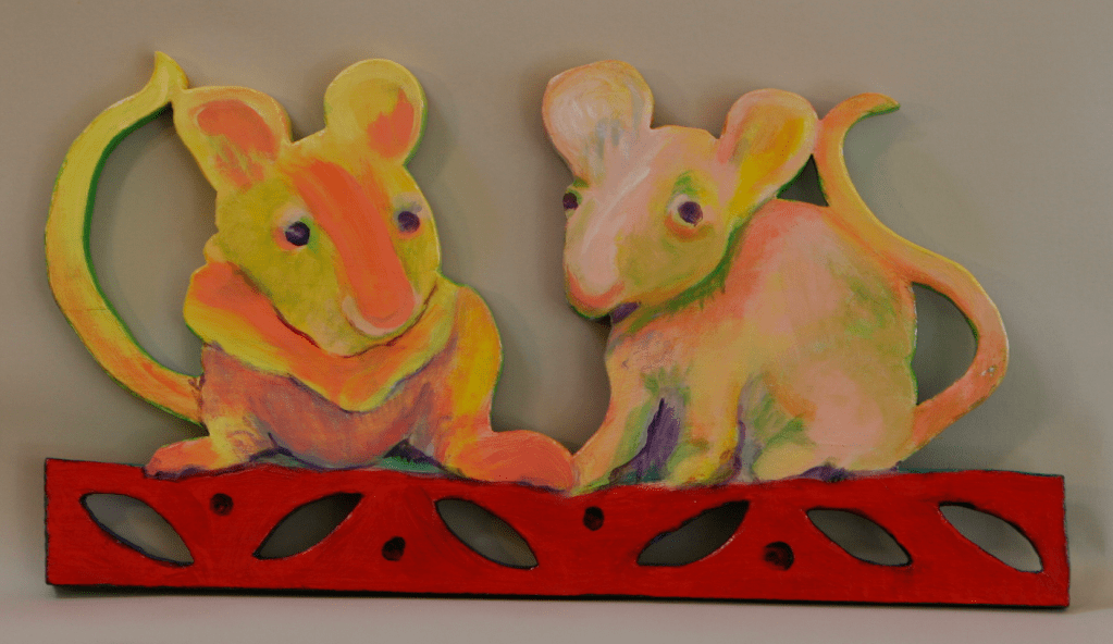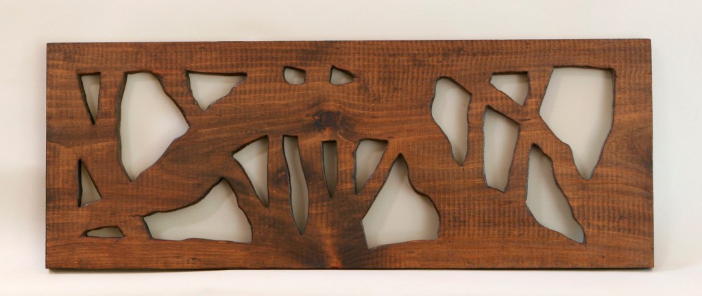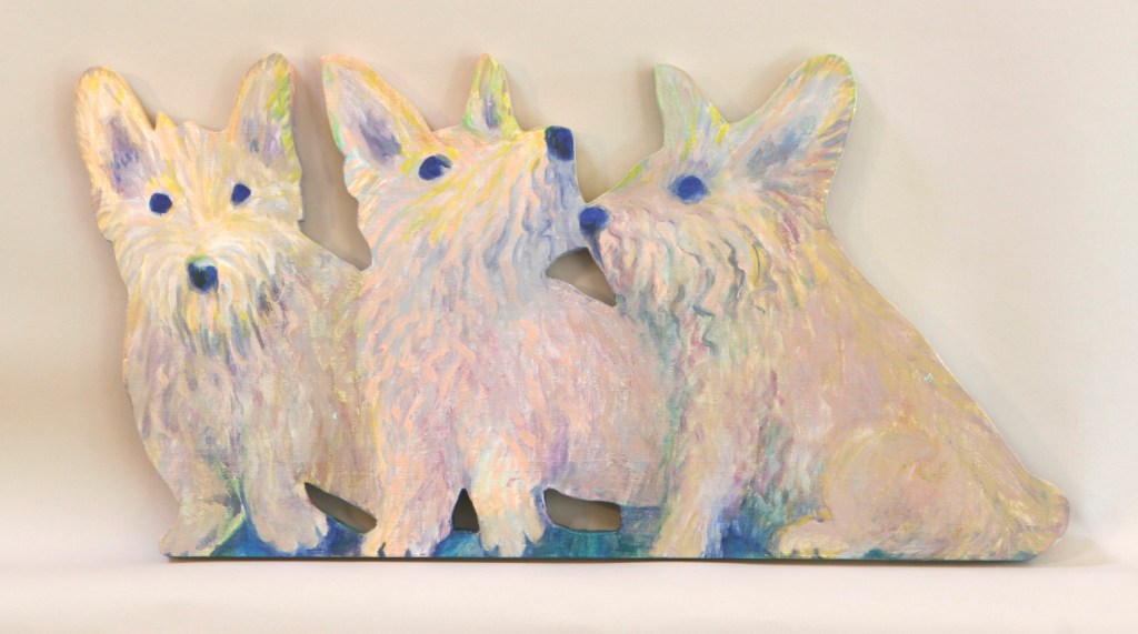 My work is first cut from a wood panel, then sanded and painted. The paintings have cut-out areas to add a sculptural quality and folk art tone. Each piece is clear coated to protect it for outdoor exposure. To keep the colors bright an additional clear coat is desired once a year.