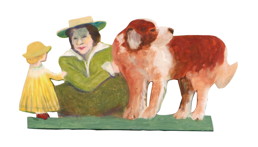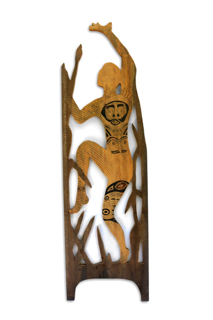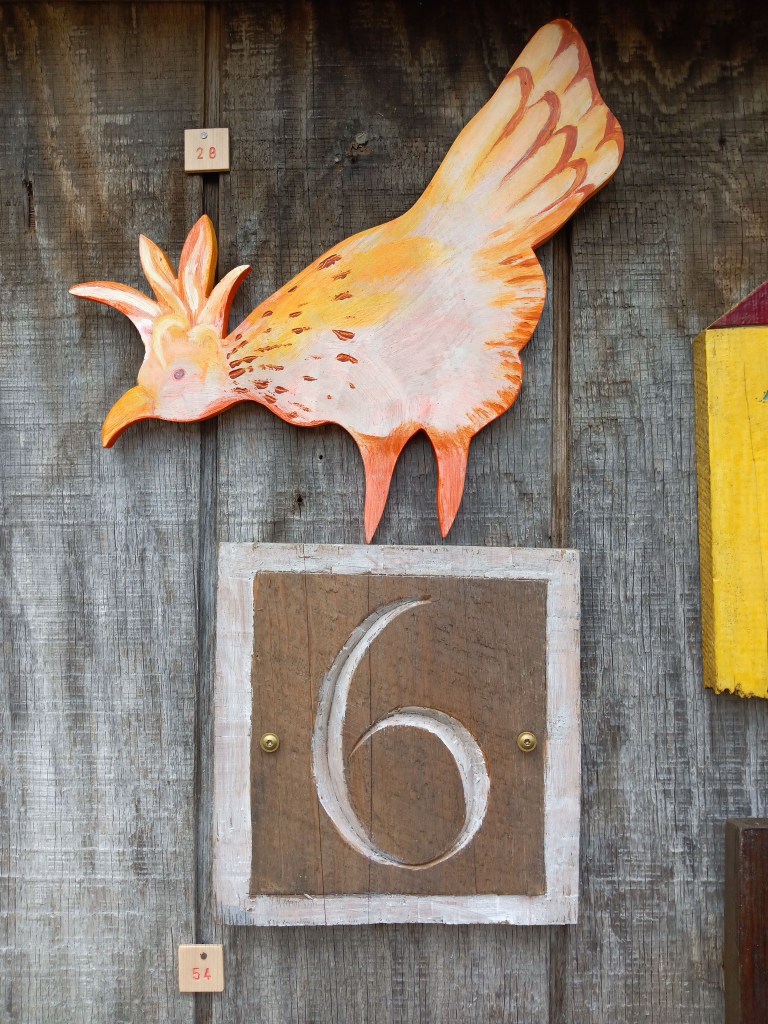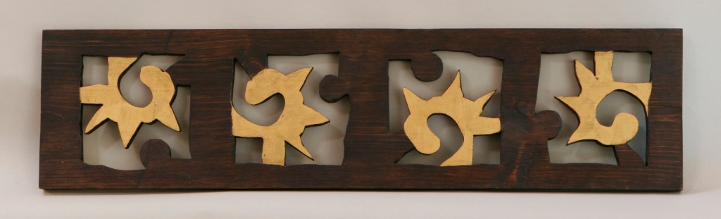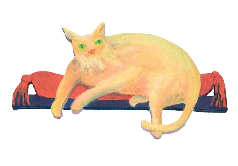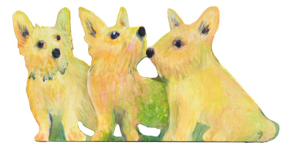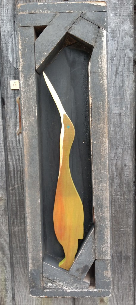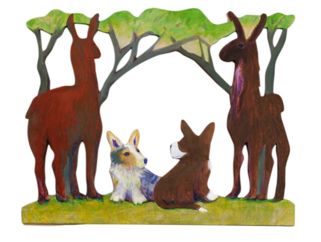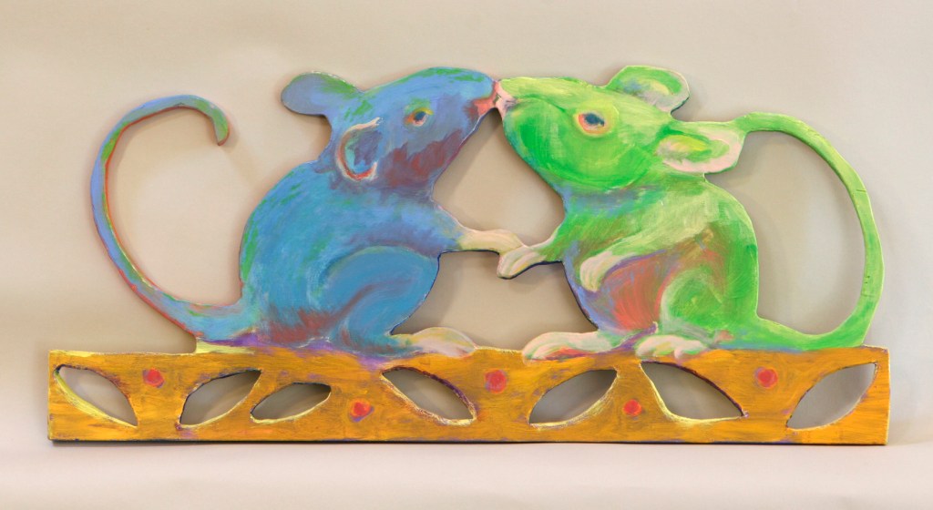 My work is first cut from a wood panel, then sanded and painted. The paintings have cut-out areas to add a sculptural quality and folk art tone. Each piece is clear coated to protect it for outdoor exposure. To keep the colors bright an additional clear coat is desired once a year.